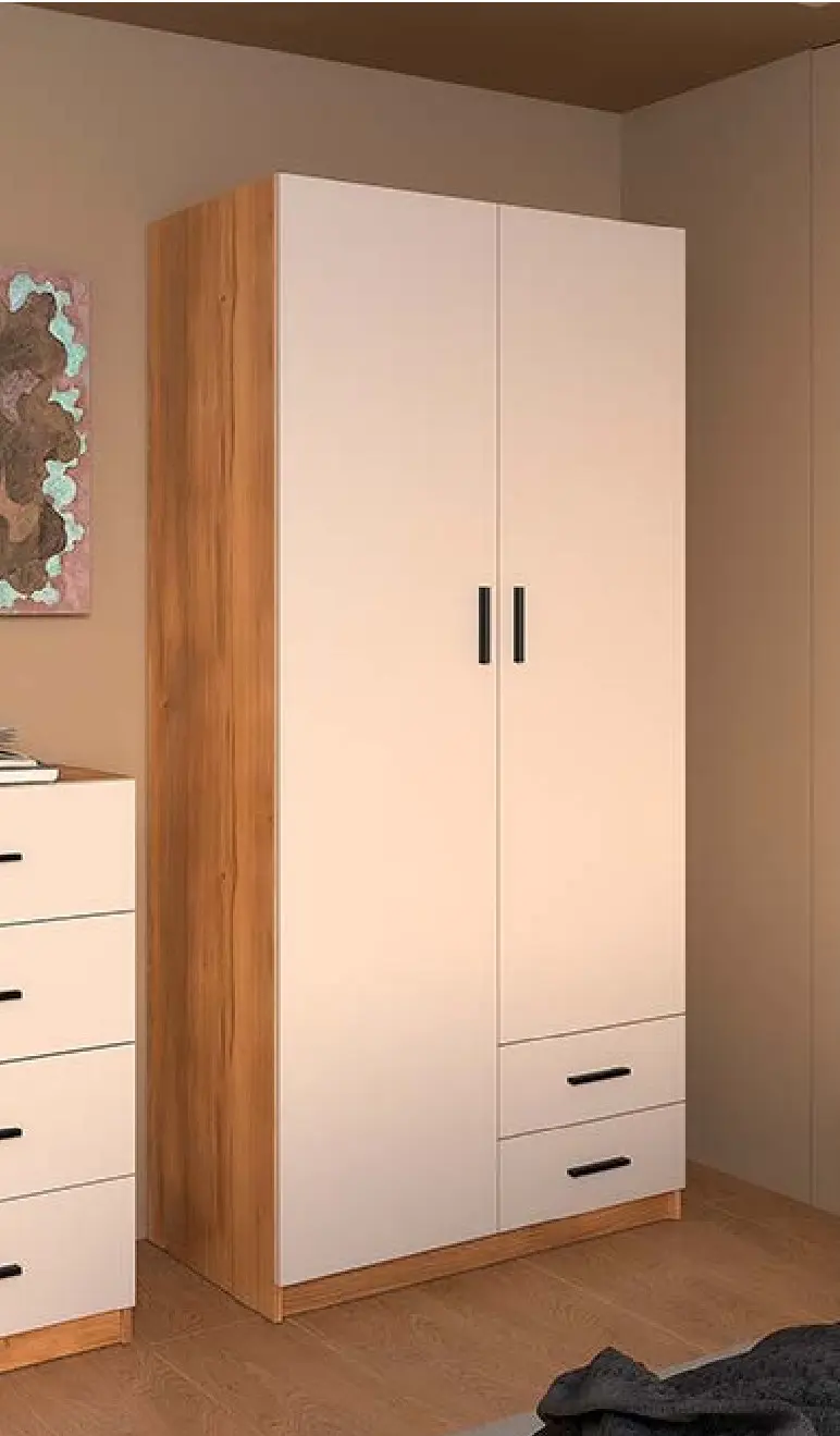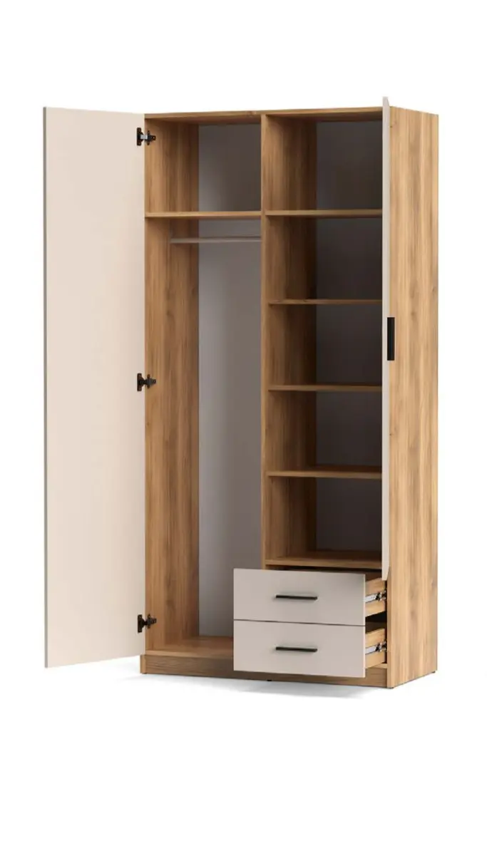 El Armario ELBA 2 puertas y 2 cajones es la solución perfecta para mantener el orden sin renunciar al estilo. Sus dos puertas y dos cajones inferiores proporcionan una organización versátil con 6 estantes y una barra para colgar, adaptándose a ropa y accesorios de todo tipo. Su diseño cálido y moderno se integra en cualquier estilo decorativo, aportando elegancia al dormitorio. Ideal como armario principal o complemento de habitaciones auxiliares.