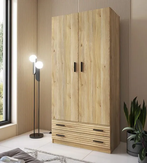 Dispone de dos puertas con barra para colgar prendas largas y cortas, junto con dos cajones inferiores amplios y funcionales. Por tanto, este armario se convierte en una alternativa práctica y económica frente a modelos similares  manteniendo un precio accesible sin renunciar al diseño.
