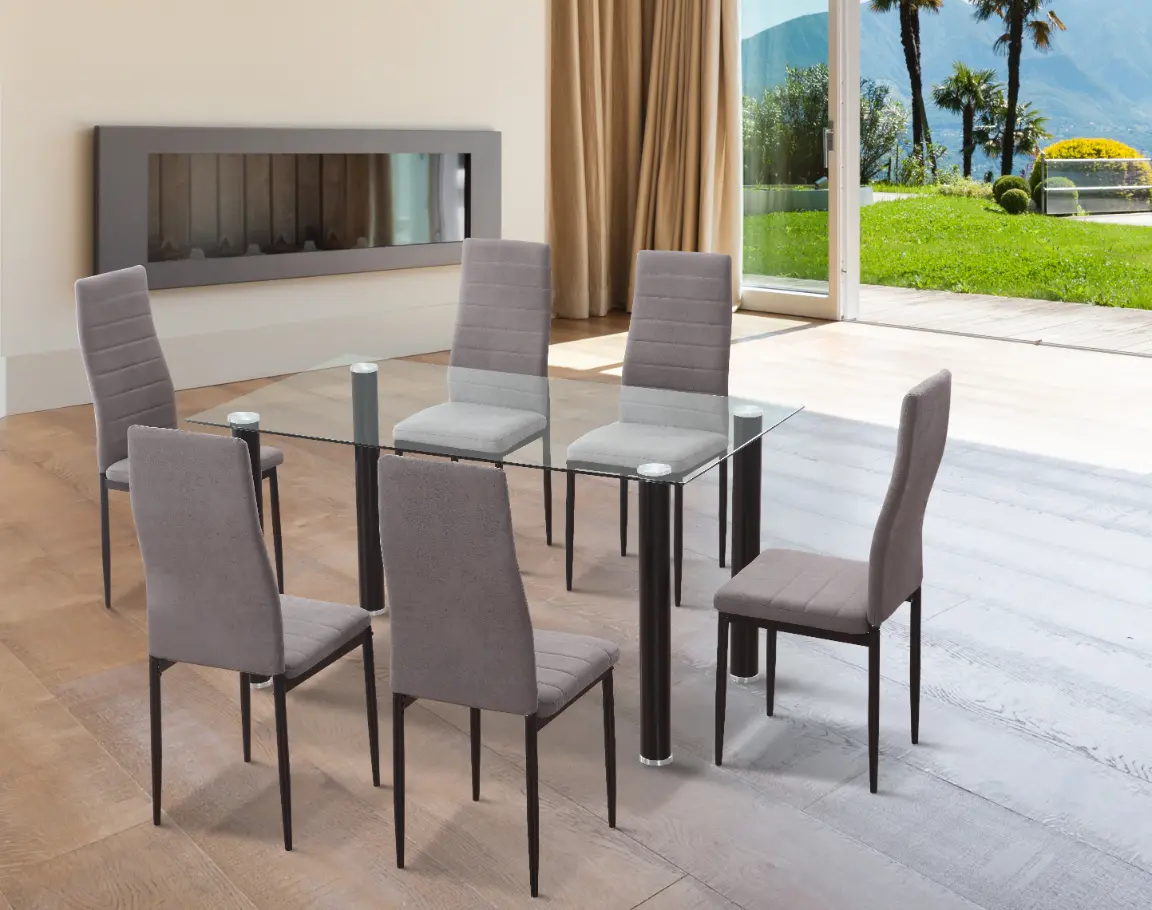 El Conjunto de mesa y 6 sillas YURI combina diseño moderno y funcionalidad. La mesa de cristal templado con patas metálicas y las sillas tapizadas en Jarama color marengo ofrecen confort y estilo.