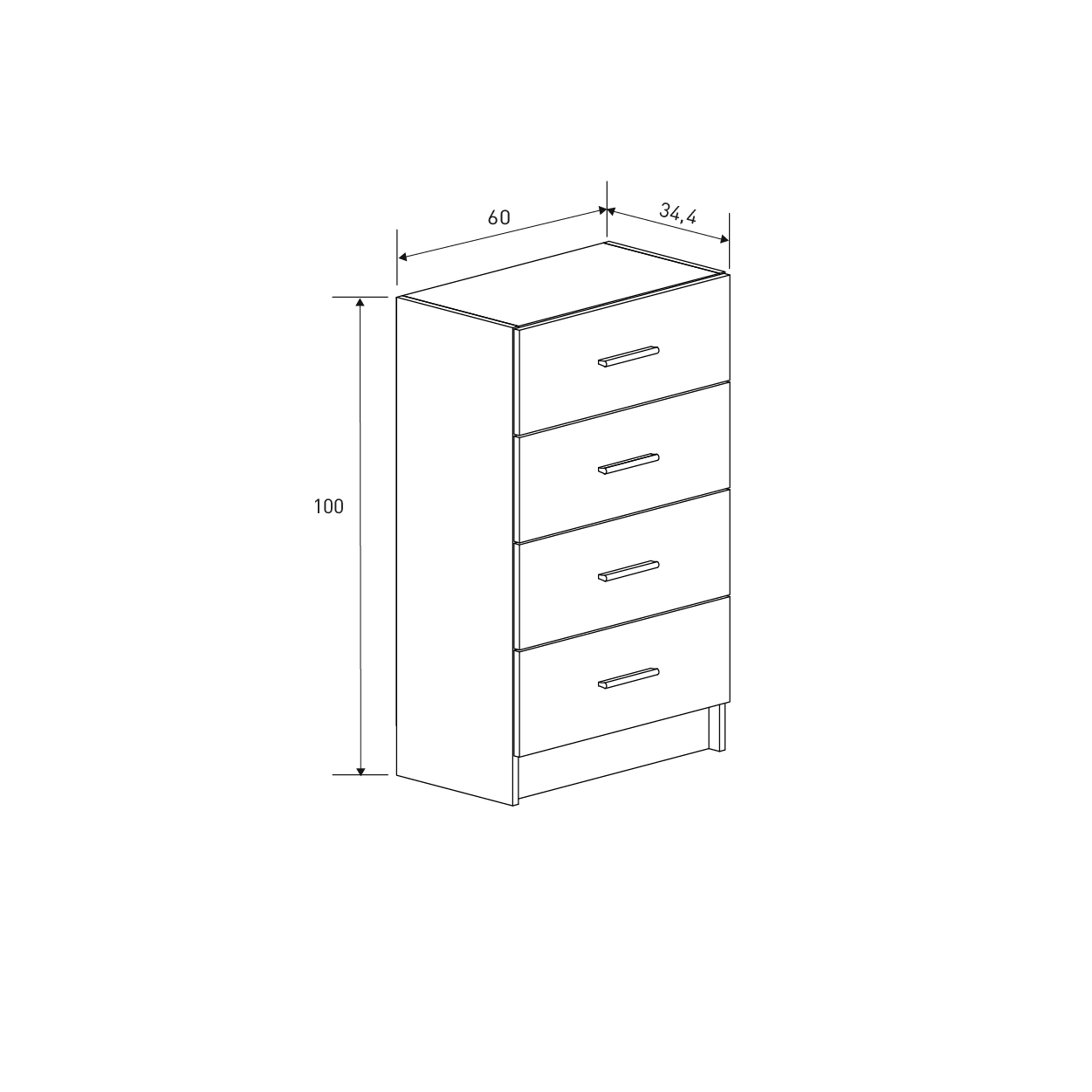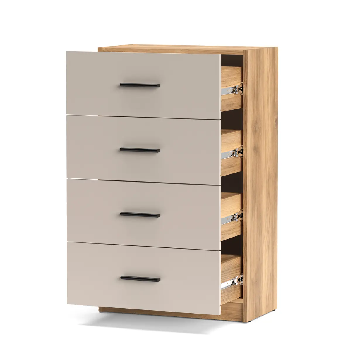 El Sinfonier 4 cajones ELBA es un mueble auxiliar práctico y decorativo que permite aprovechar el espacio vertical sin sacrificar estilo. Fabricado en melamina de alta resistencia con estructura Mauvella y frentes beig, aporta un toque moderno y cálido al dormitorio. Su diseño compacto y minimalista lo hace perfecto como sinfonier juvenil, sinfonier para dormitorio moderno o como complemento de otros muebles de la Colección ELBA. Los tiradores en negro mate ofrecen un contraste elegante que realza su acabado.